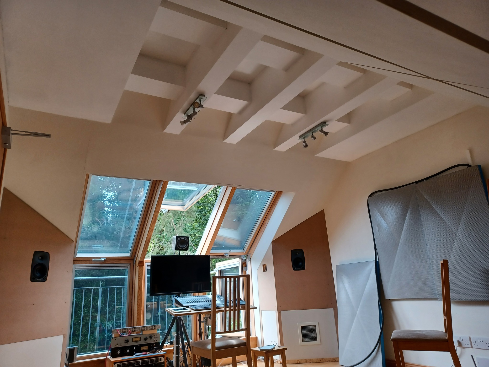 The ceiling in the main room used to be flat all the way across, with acoustic absorbers hanging below it. I decided to make it one foot (30cm) higher by installing recesses between the rafters to improve the acoustics for mixing and recording,